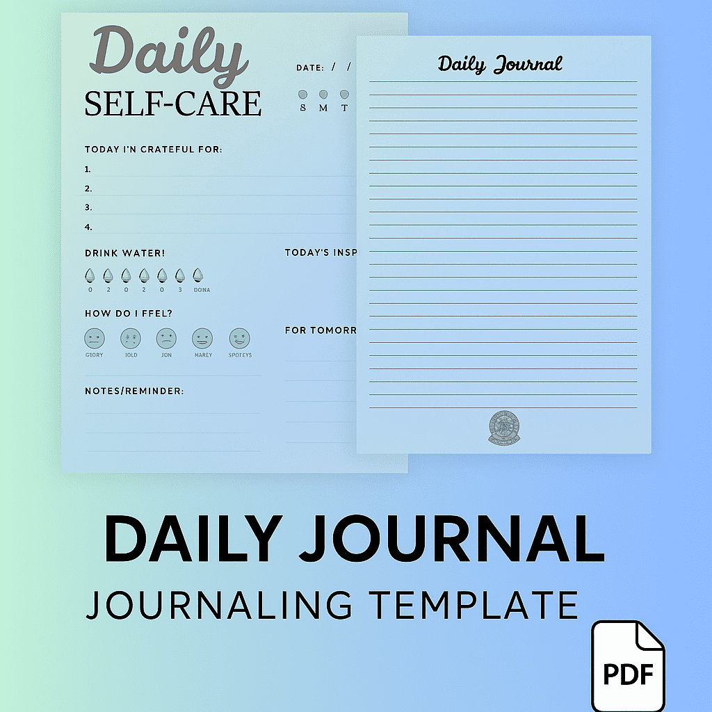 Daily journaling template for self-care, gratitude, mood tracking, and reflection.